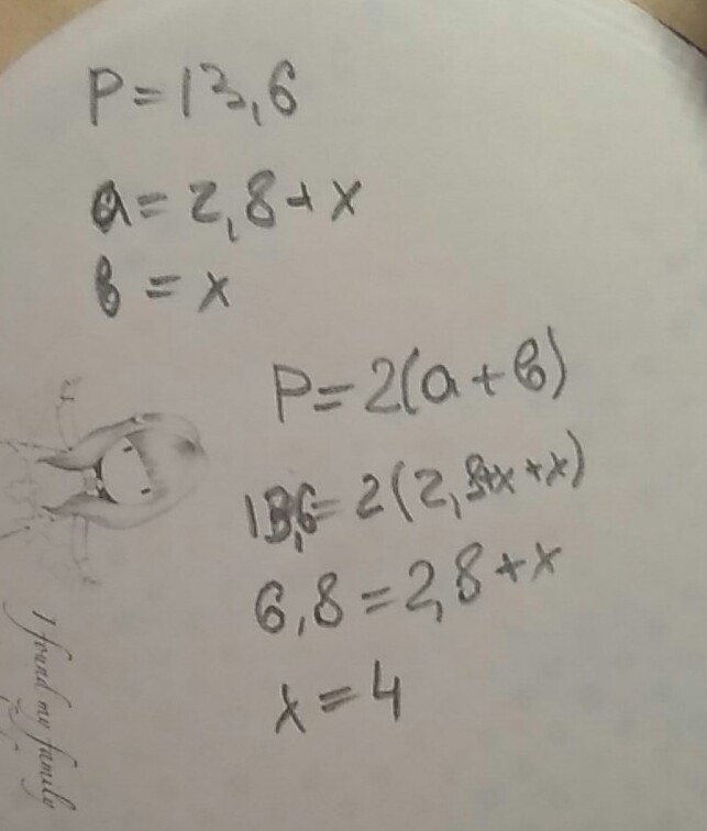 Периметр прямоугольника 13,6 см, причем его ширина на 2,8 см меньше длины. Найти площадь прямоугольника.