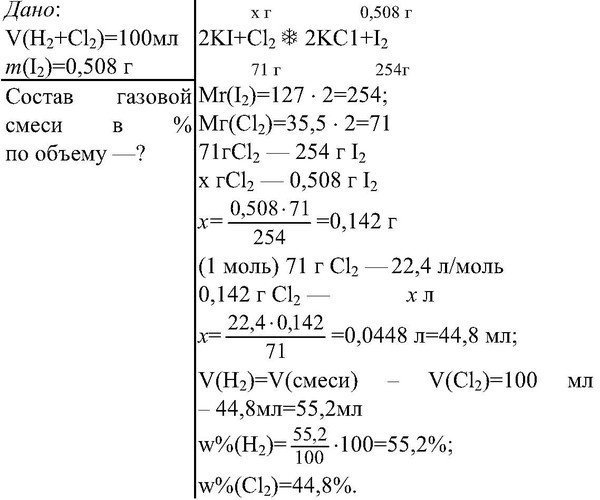 СОООС!!!!ПОООМОООГИИИТЕЕ!!!! через раствор иодида калия пропустили 100 мл газовой смеси, предназначенной для синтеза хлороводорода.В результате выделилось 0, 508 г иода. Каков был состав газовой смеси в процентах( по объему)?