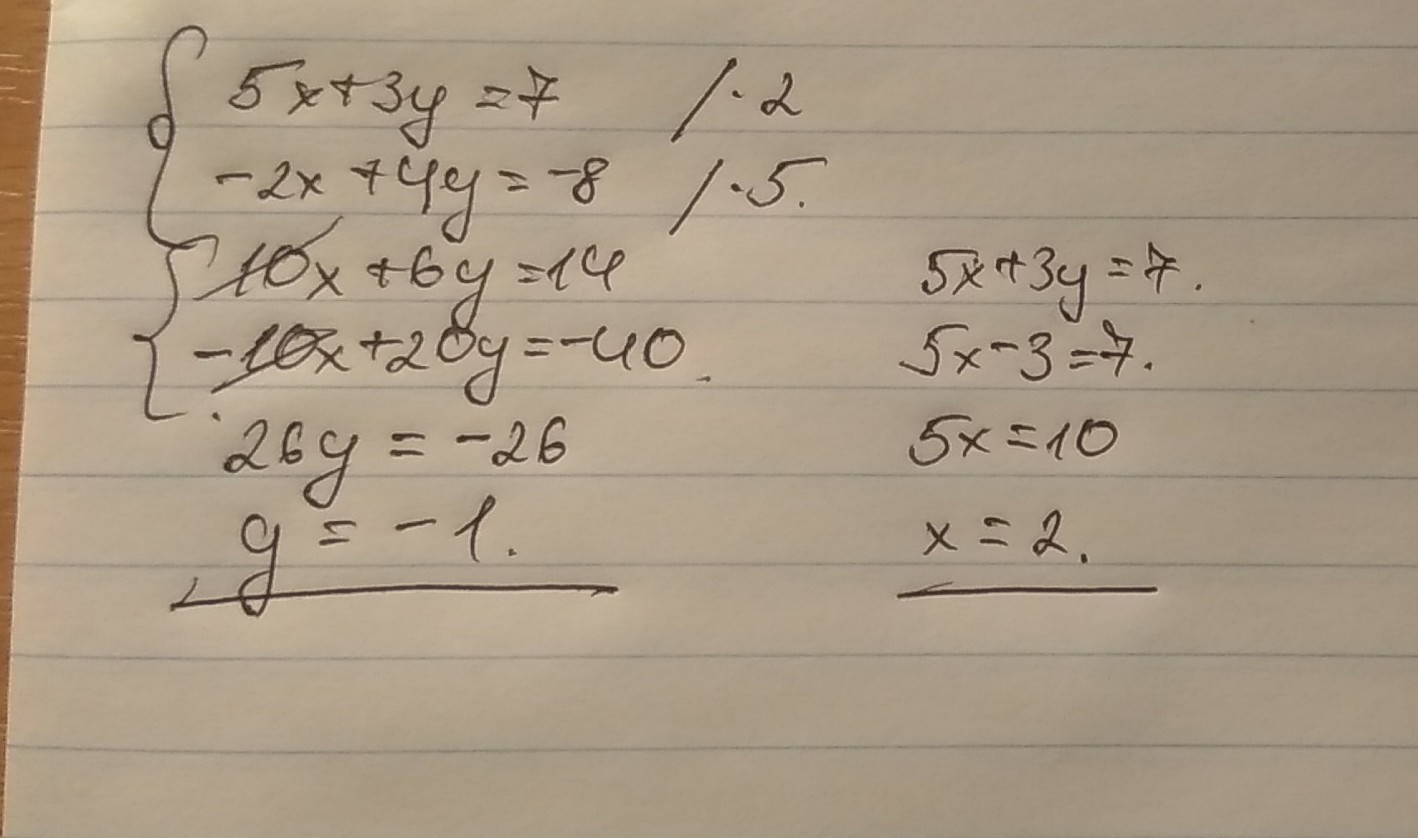 решение , замените последнюю скобку, ответ: х= 2, у= -1
