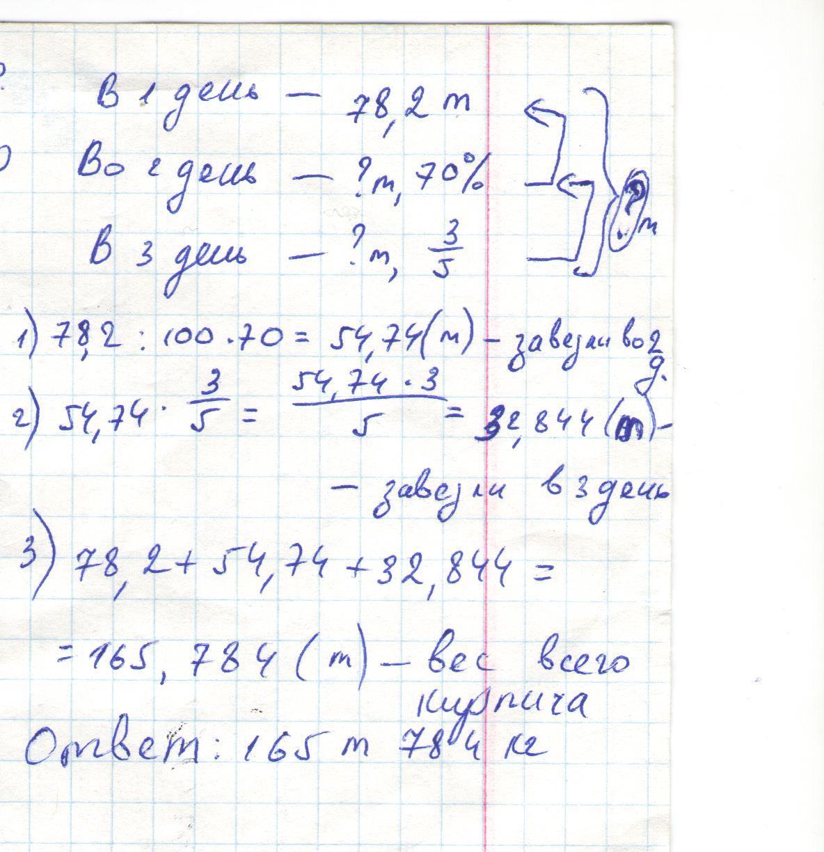 на стройку в 1 день завезли 78,2 тонн кирпича,а во 2 день-70% заведённого в 1 день в 3 день поставили 3/5 завоза 2 дня найти вес всего кирпича