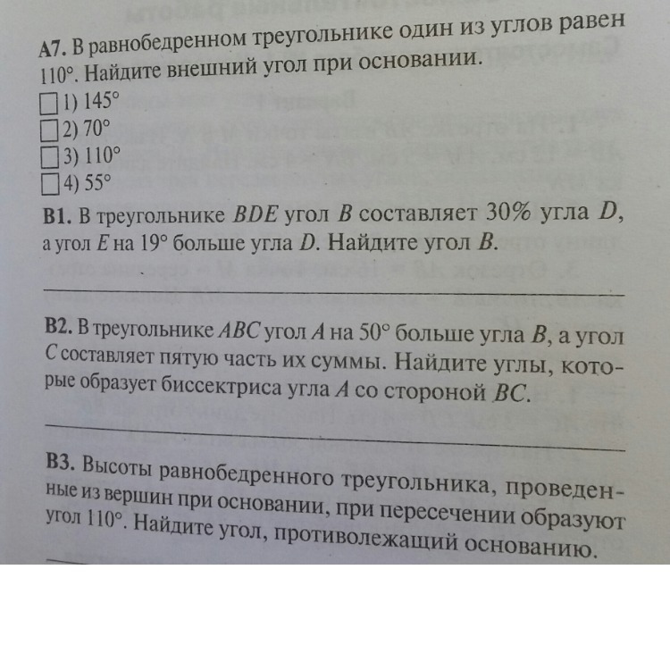 А7: угол равный 110 лежит напротив основания. углы при основании равны по (180-110):2=35 градусов. Внешний угол при основании равен 180-35=145 градусов.
