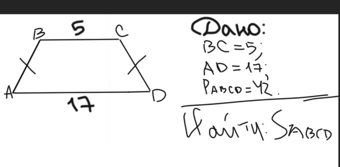 Найдите площадь равносторонней трапеции, если ее основания равны 5 см и 17 см, а периметр 42 см.