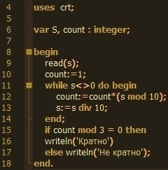 Дано трехзначное число составить программу которая определят кратно ли 3 произведение его цифр ( на языке паскаль)