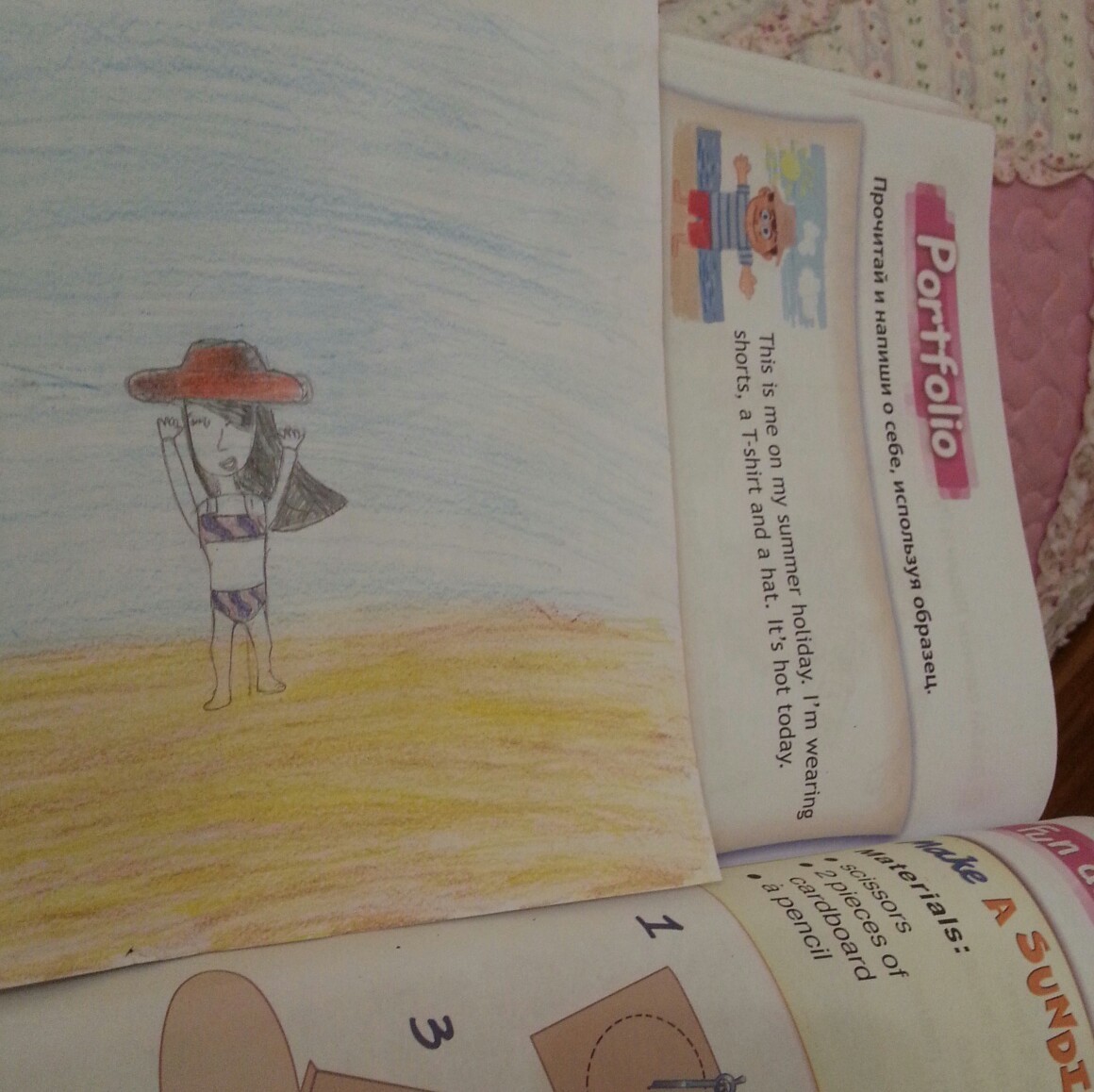 Это я на летних каникулах.На мне одеты шорты,футболка и шляпа.Сегодня жарко.