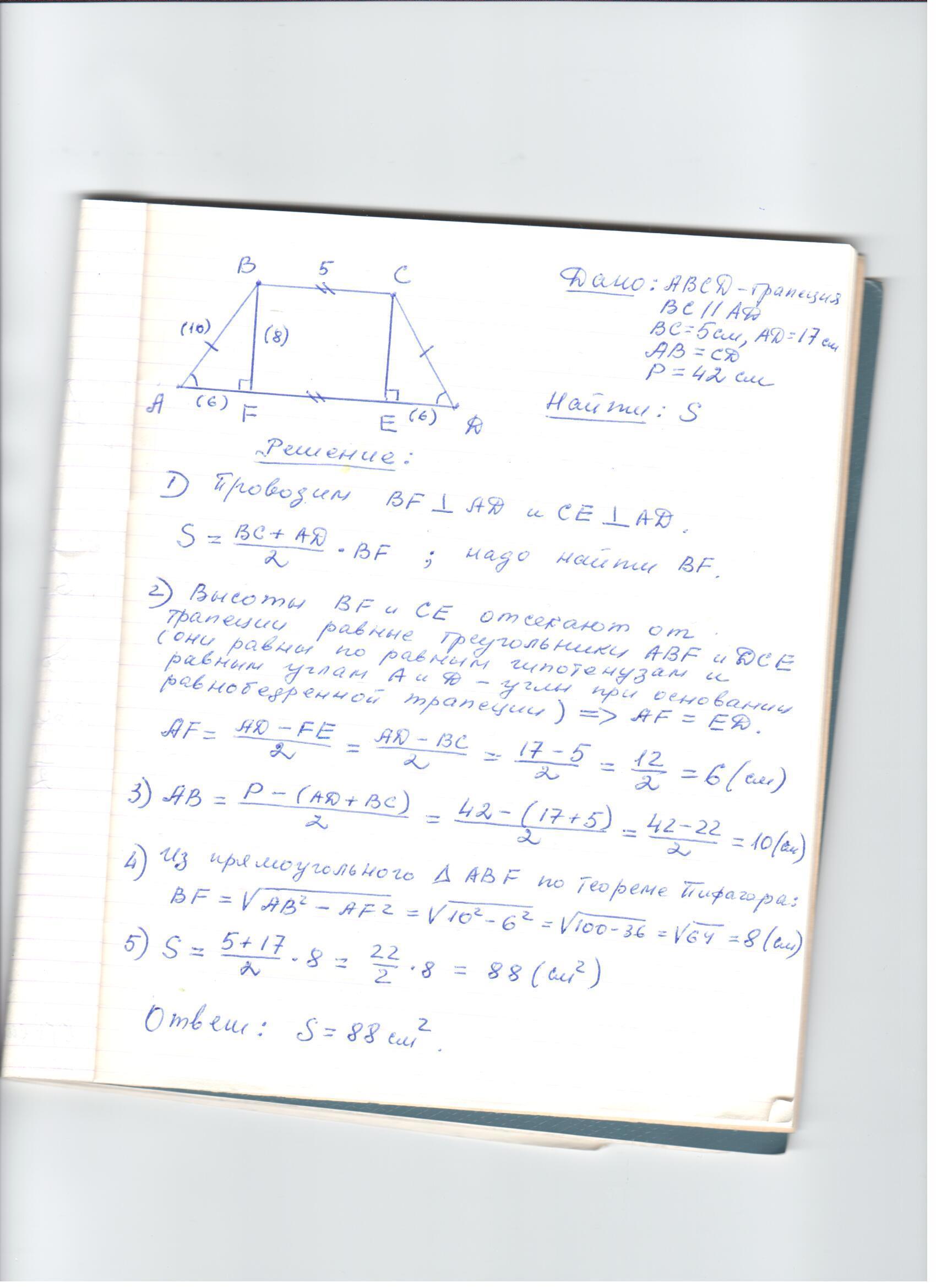 Найдите площадь равносторонней трапеции, если ее основания равны 5 см и 17 см, а периметр 42 см.