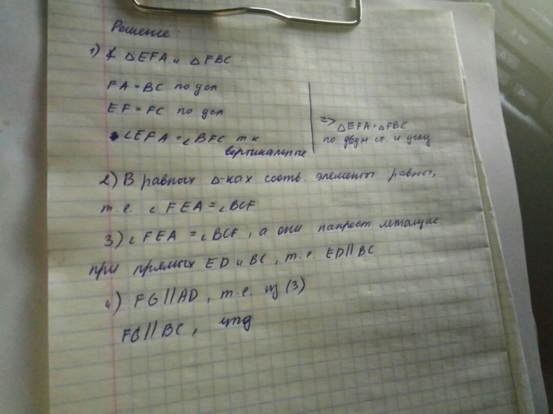 Из равенства треугольников следует: углы AEF и BCF равны как соответственные элементы. Но углы AEF и BCF - накрест лежащие при прямых AD и BC и секущей ЕС. Значит, BC II AD (по признаку параллельности прямых).