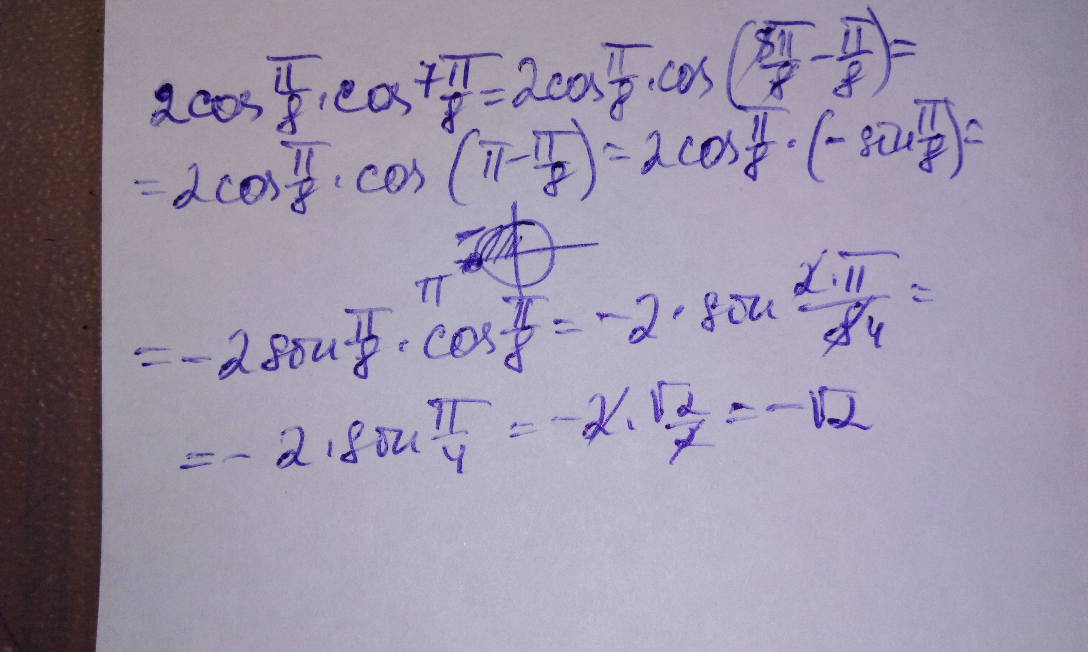 корень2*cos П8 * cos 7П8 Ответ: -0,5 , но у меня не выходит. Может у вас получится , если что кидайте решение.