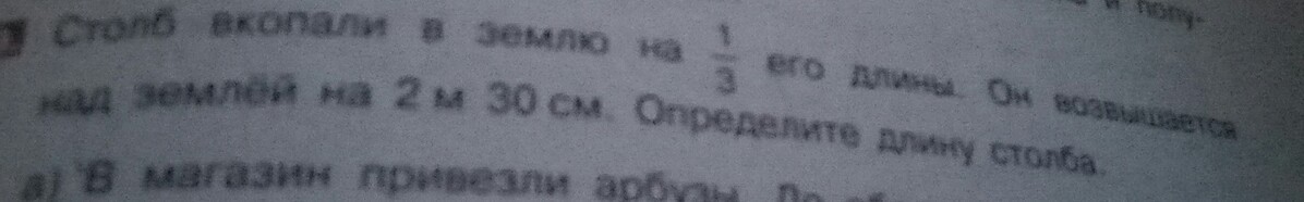 помогите зделаит задачю про дропь сТоллб был закон в землю 1/3 часть а взовышен землей 2 М 30 СМ