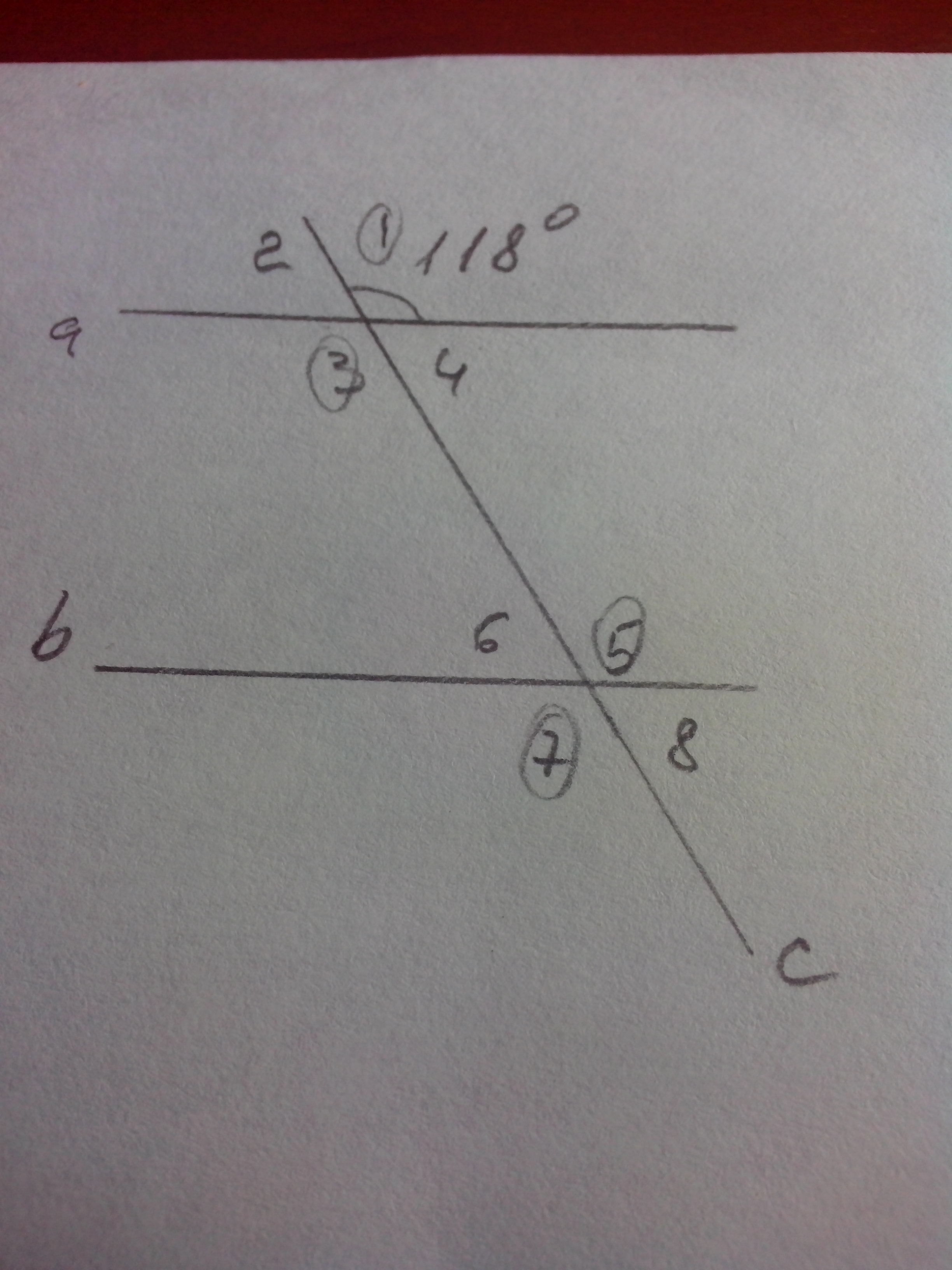Один из углов, образованный при пересечении двух параллельных прямых секущей, равен 118°. Найдите градусные меры остальных семи углов.