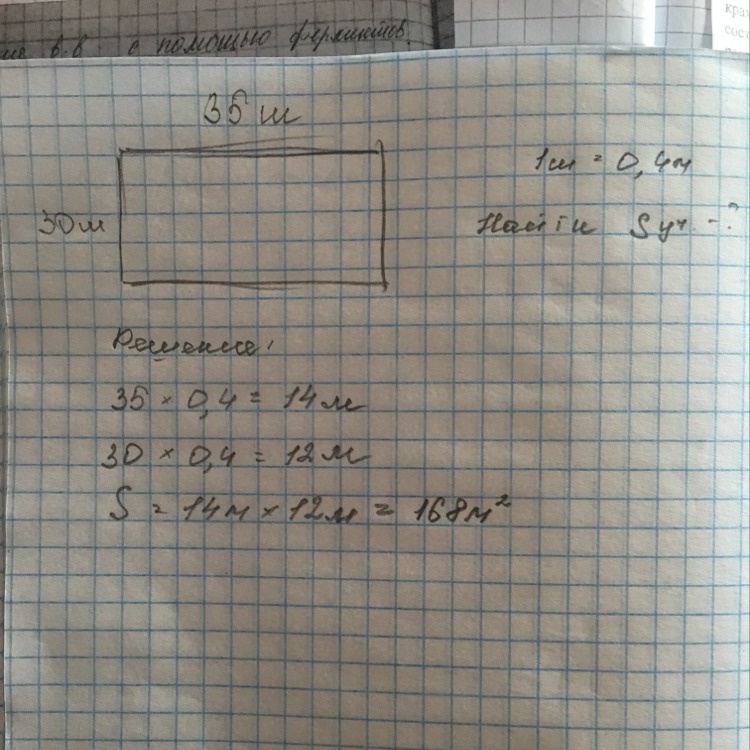 пройдя по периметру участка прямоугольной формы ,олег заметил .что длина участка составляет 35 шагов .а ширина на 5 шагов меньше. найдите площадь участка,если длина шага равна 0,4м