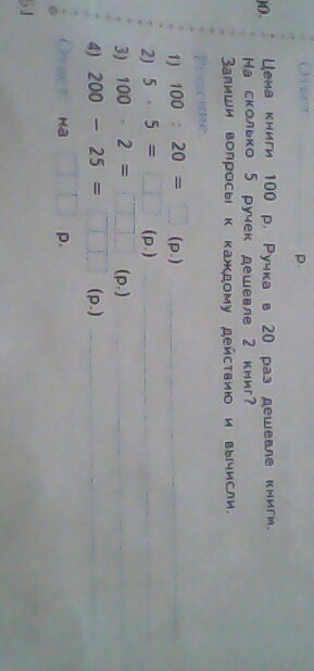 Цена книги 100р. Ручка в 20 раз дешевле книги. На сколько 5 ручек дешевле 2 книг? Записи вопросы к каждому действию и вычисли. Пожалуйста решите задачу.