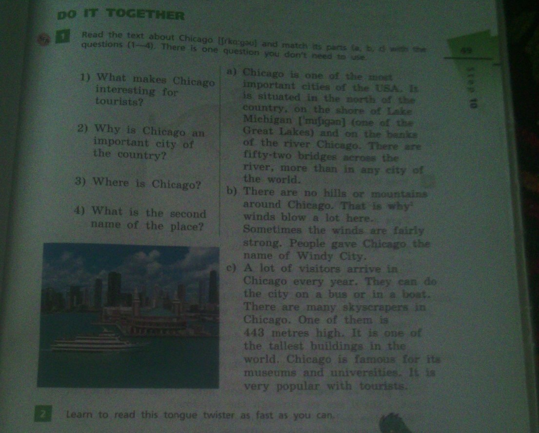 в) Множество посетителей прибывает в Чикаго каждый год. Они могут осмотреть город на автобусе или на лодке. В Чикаго много небоскрёбов. Один из них имеет высоту 443 метра. Это одна из высочайших построек мира. Чикаго знаменит своими музеями и университетами. Это очень популярный у туристов город.