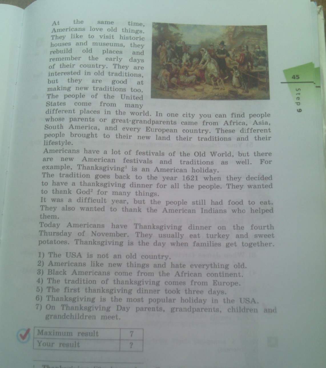 Сегодня американцы устраивают благодарственный обед в четвёртый четверг ноября. Обычно они едят индейку и сладкую картошку. День благодарения - это день, когда семьи собираются вместе.