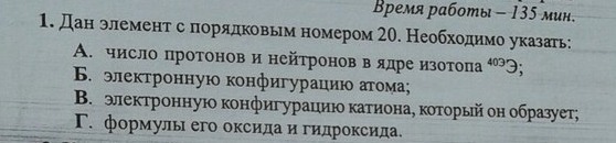 Дан элемент с порядковым номером 20. Необходимо указать: