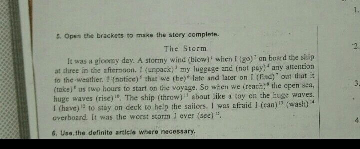Был хмурый день. Дул штормовой ветер, когда в 3 часа дня я поднялся на борт корабля . Я распаковал свой багаж и не обратил внимание на погоду. Я заметил, что мы опаздываем и позже я обнаружил, что прошло два часа прежде чем мы отплыли. Поэтому когда мы вышли в открытое море, поднялись огромные волны. Корабль кидало словно игрушку на огромных волнах. Мне пришлось остаться на палубе и помогать матросам. Я боялся, что меня снесет за борт. Это был самый худший шторм, который я когда- либо видел.