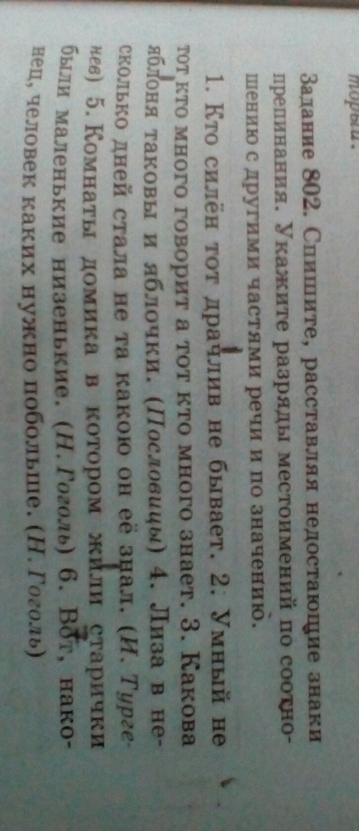 1. Кто силён, тот драчлив не бывает. 2. Умный не тот, кто много говорит, а тот, кто много знает. 3. Какова яблоня, таковы и яблочки. 4. Лиза в несколько дней стала не та, какою он её знал. 5. Комнаты домика, в котором жили старички, были маленькие, низенькие. 6. Вот, наконец, человек, каких нужно побольше.