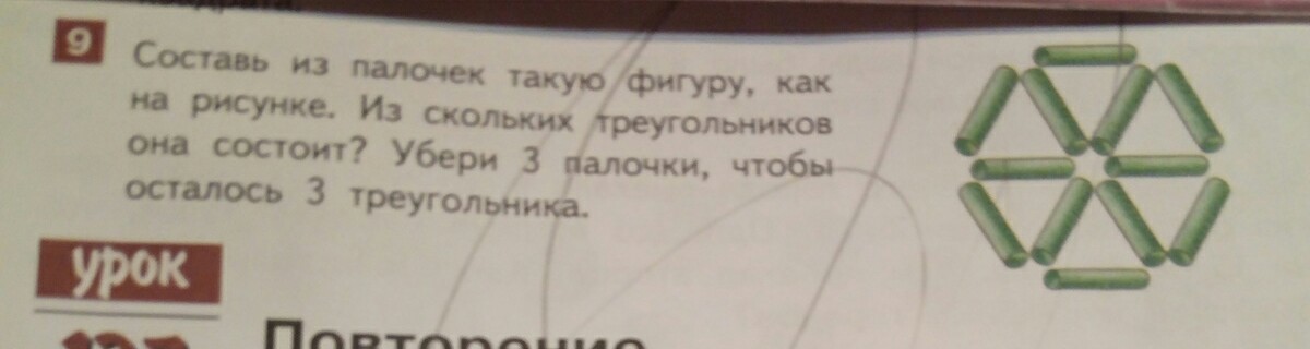 составь из палочек такую фигуру как на рисунке Из каких треугольника она состоит убери 3 палочки чтобы осталось 3 треугольника
