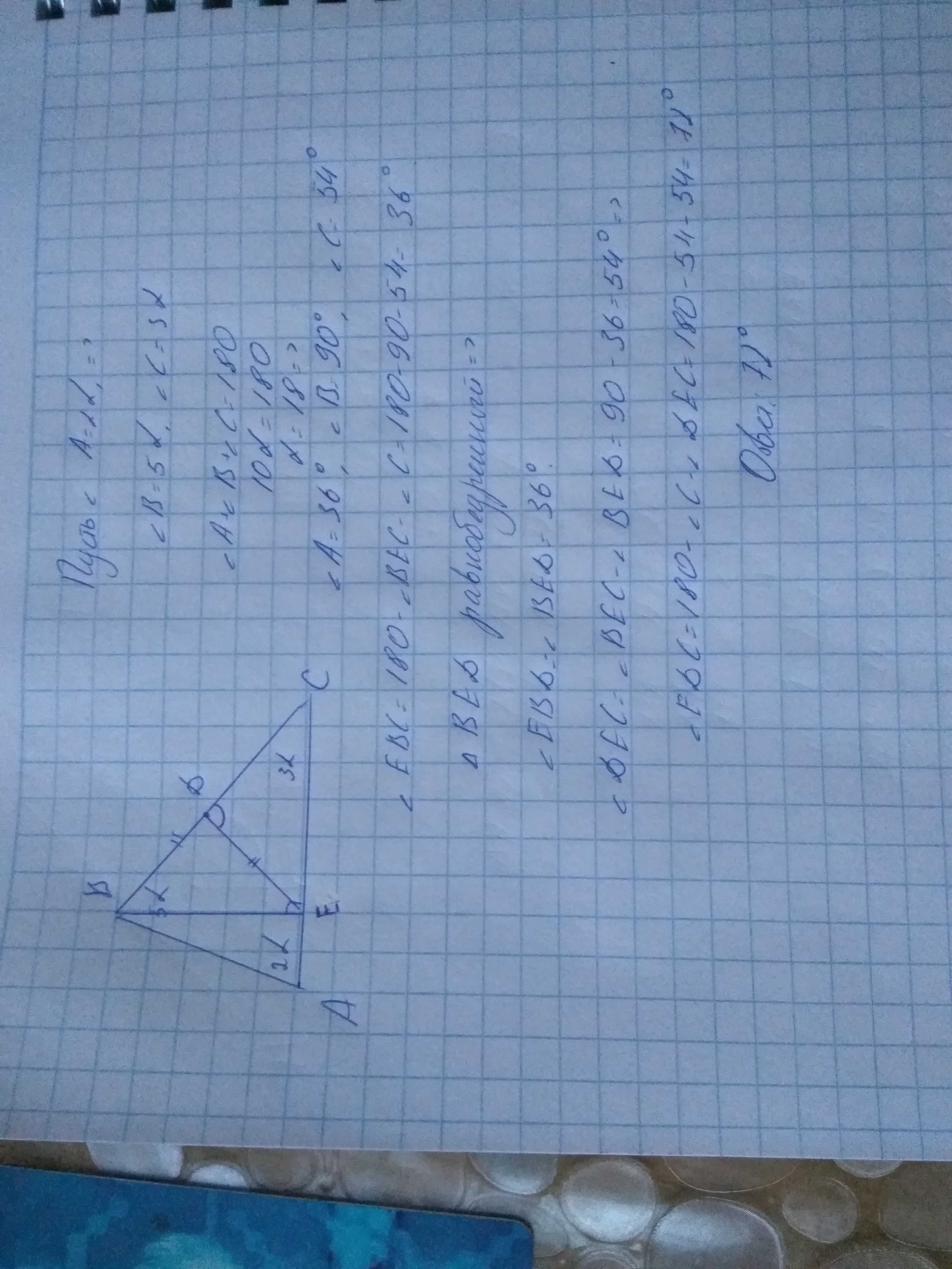 В треугольнике ABC углы относятся как 2:5:3 (Угол А - 2, угол В - 5, угол С - 3). Из вершины бОльшего угла В опущен перпендикуляр BE на противоположную сторону АС. Точка D находится на стороне ВС так, что DE=BD. Найти угол EDC.