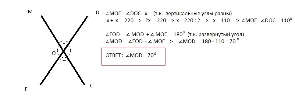сумма вертикальных углов МОЕ и DОС образованных при пересечении прямых МС и ДЕ 220 градусов Найдите угол MOD