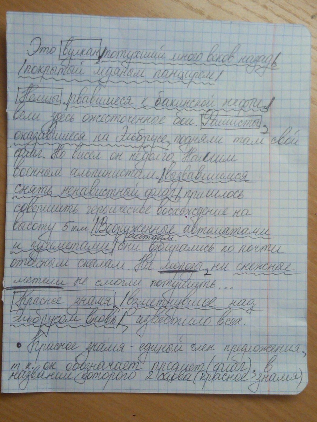 Это вулкан, потухший много веков назад, покрытый ледяным панцирем. Немцы, рвавшиеся к бакинской нефти, вели здесь ожесточённые бои. Фашисты, оказавшиеся на Эльбрусе, подняли там свой флаг. Но висел он не долго. Нашим военным альпинистам, вызвавшимся снять ненавистный флаг, пришлось совершить героическое восхождение на высоту пять с половиной километров. Вооружённые автоматами и пулемётами, они взбирались по почти отвесным скалам. Ни морозы, ни снежные метели не смогли потушить их любви к Родине. Красное знамя, взметнувшееся над Эльбрусом вновь, известило всех об освобождении Кавказа.