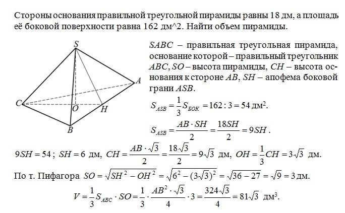 Стороны основания правильной треугольной пирамиды равна 18 дм,а площадь её боковой поверхности равна 162 дм^2. Найти объем пирамиды. Помогите пожалуйста.