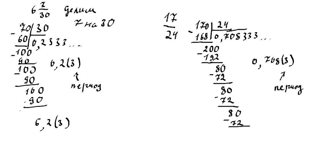 просто начинаем делить в столбик, пока не доходим до периода, это повтор числа, хоть бесконечно дели, одно и то же получается... там и там период 3 подробнее во вложении.