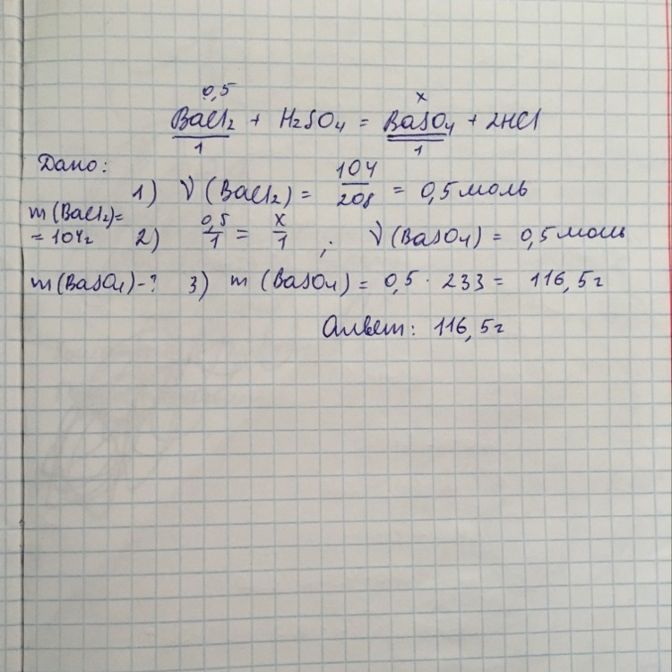 Какая масса соли получится в уравнении, если в реакцию с кислотой вступило 104 граммов хлорида бария