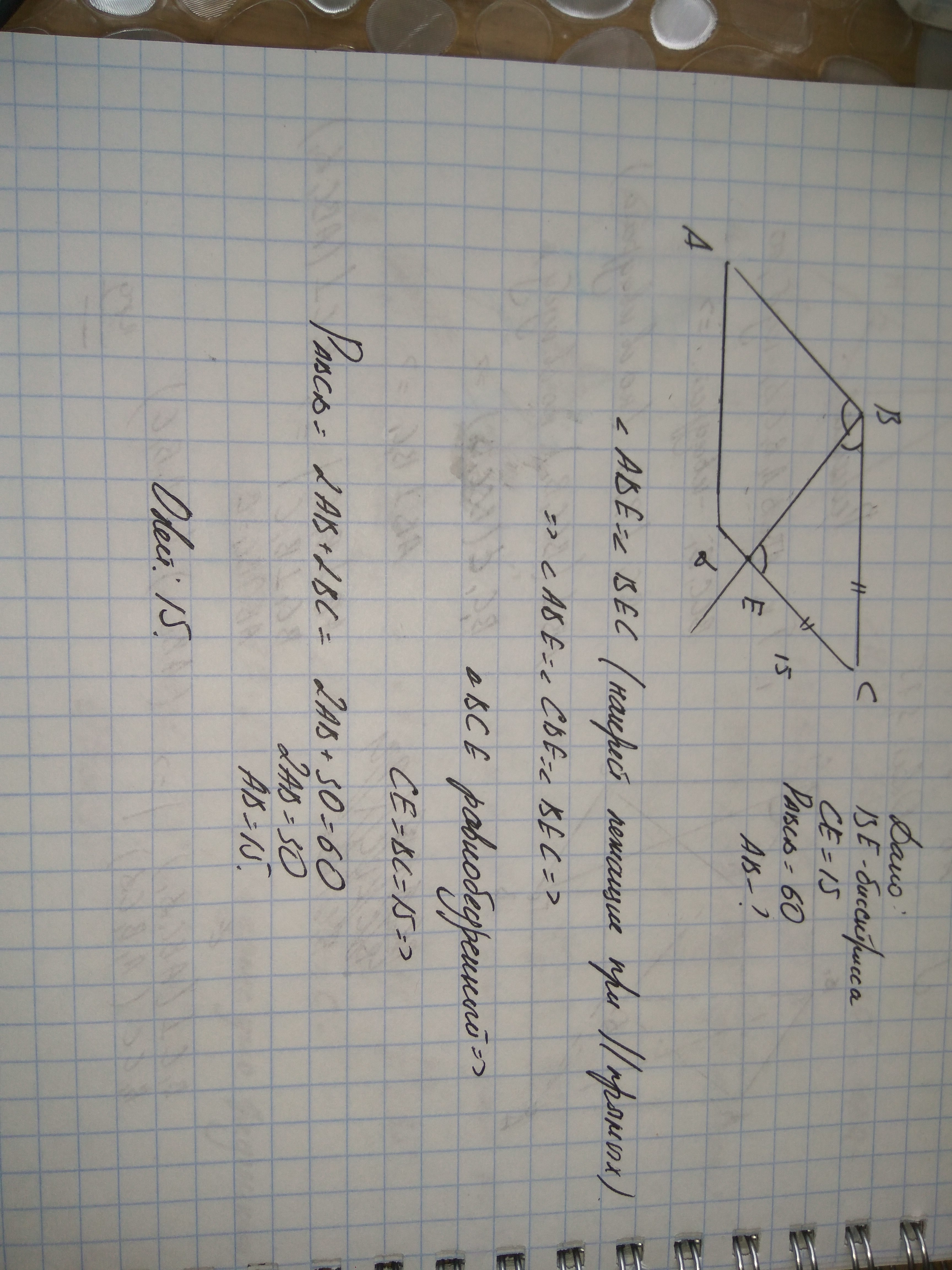 В параллелограмме АВСД проведена биссектриса угла АВС, которая пересекает сторону СД в точке Е. Найдите АВ, если СЕ=15см, а периметр параллелограмма равен 60см.