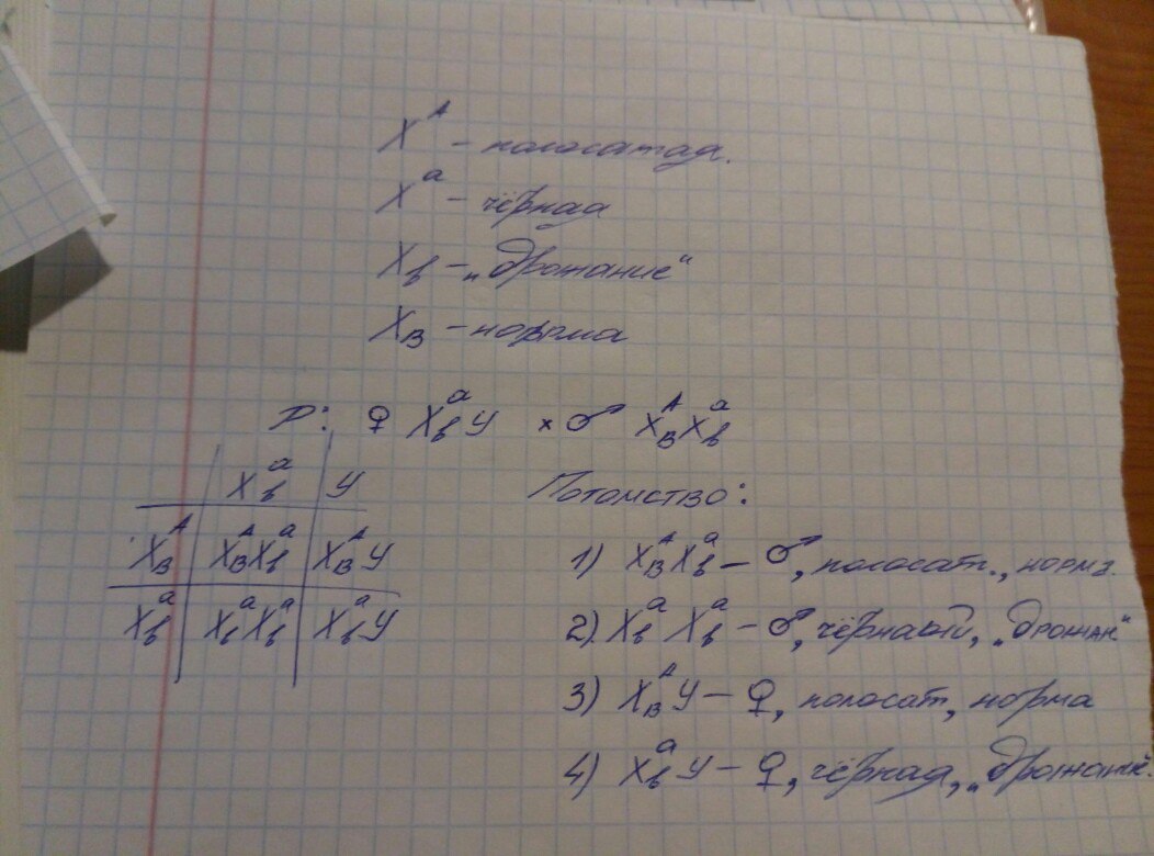 У кур гены, определяющие окраску оперения, локализованы в X-хромосоме. При этом ген, обусловливающий полосатую окраску, доминирует над геном, обусловливающим черную окраску. Там же расположен рецессивный ген «дрожания» (особи жизнеспособны). Гены тесно сцеплены. Какое будет потомство при скрещивании черных кур с «дрожанием» с гетерозиготным полосатым петухом, гомозиготным по норме (отсутствие «дрожания»)?