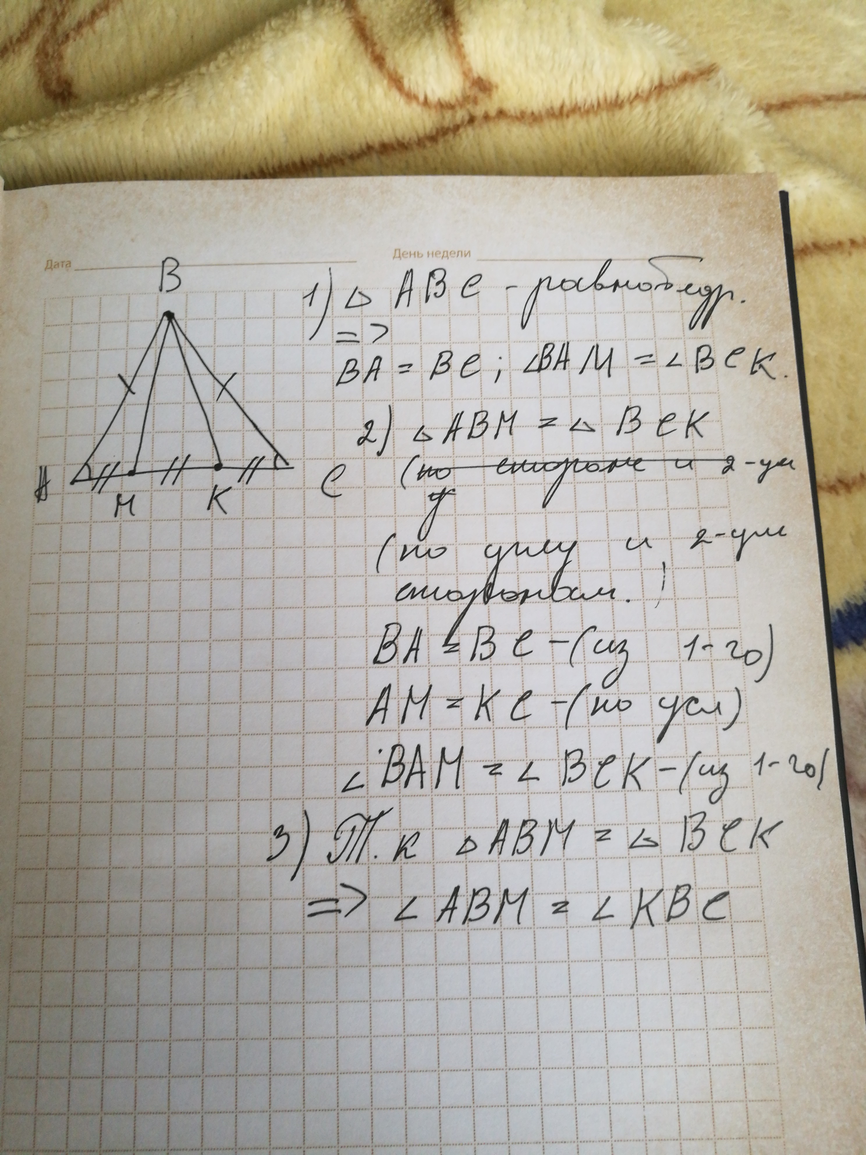 На основании AC равнобедренного треугольника ABC отметили точки M и К такие, что AM=CK, точка М лежит между точками А и К. ДОКАЖИТЕ, ЧТО угол ABM= углу СВК