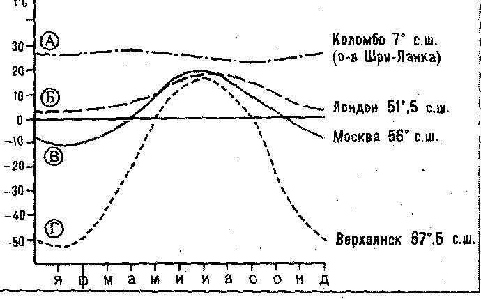 Годовая амплитуда температур - это разница между температурами самого теплого и холодного месяца, то есть января и июля. По графику видно, что наименьшую амплитуду имеет температура в Коломбо, так как линия, показывающая годовой ход температуры в данном городе искривлена меньше всего, что объясняется положением возле экватора, где круглый год температура поддерживается относительно постоянной.