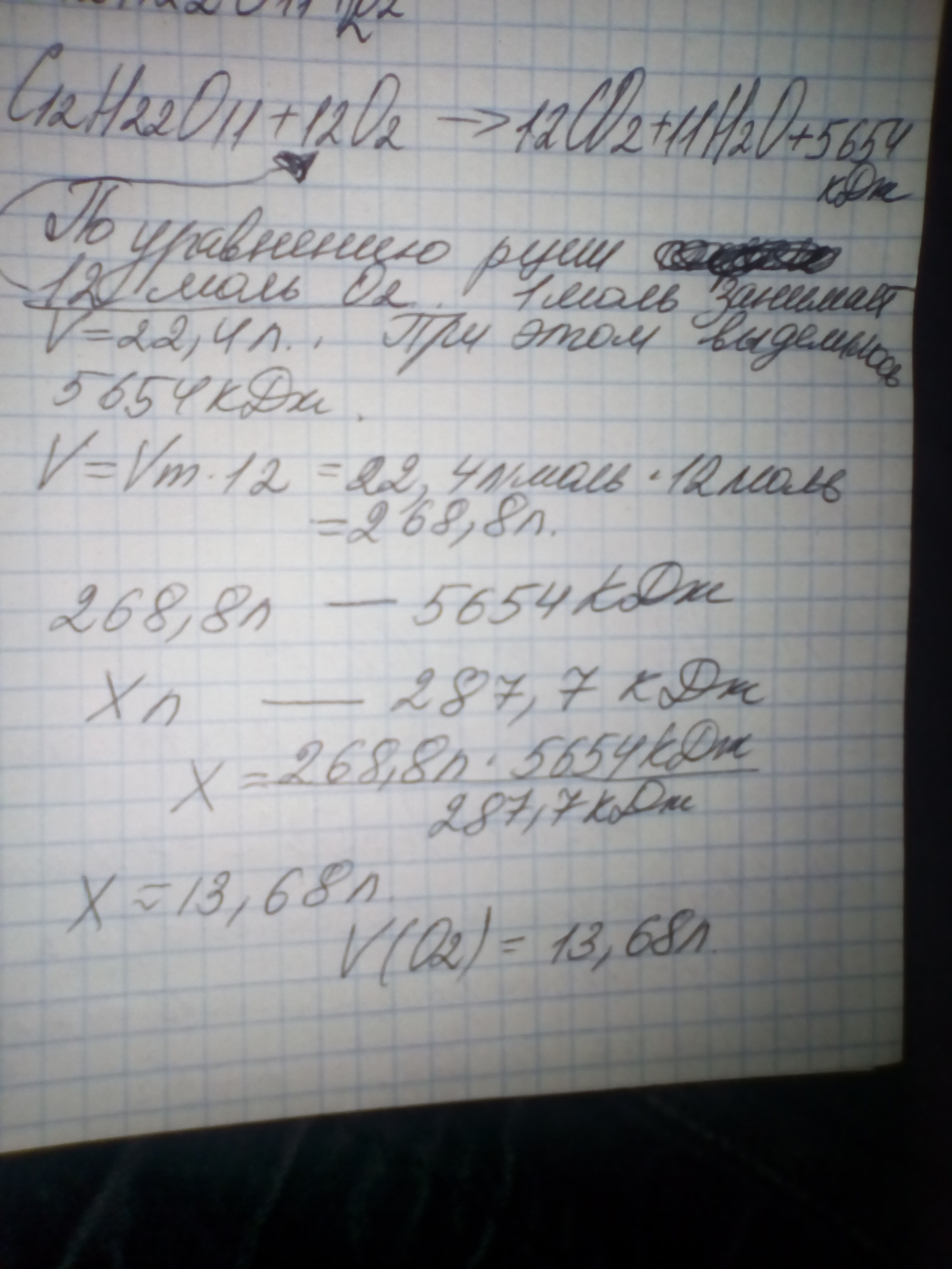 Рассчитайте бьем кислорода(н.у) который потребуется для полного окисления сахорозы, если при этом выделятся 287,7 кдж теплоты (тепловой эффект реакции составляет 5654 кдж)