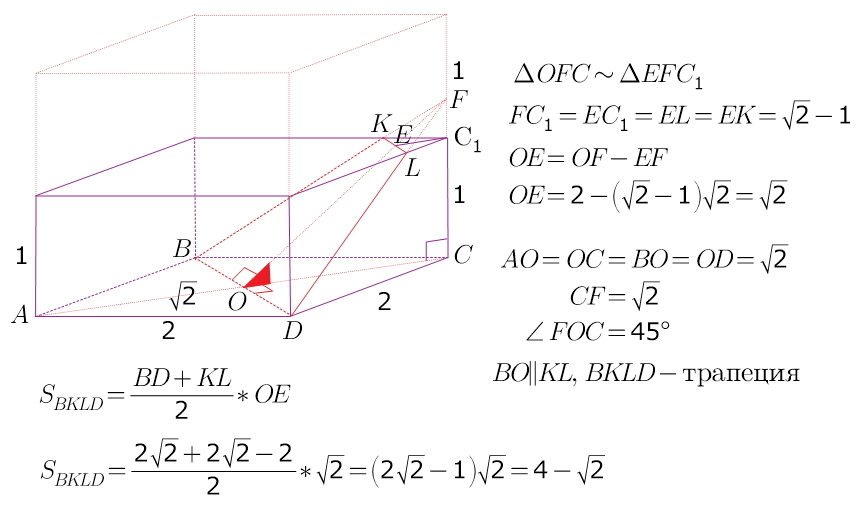 В прямоугольном параллелепипеде основание - квадрат. Через диагональ основания проведена плоскость, составляющая с плоскостью основания угол 45 градусов. Найдите площадь полученного сечения, если измерения параллелепипеда равны 2,2,1.