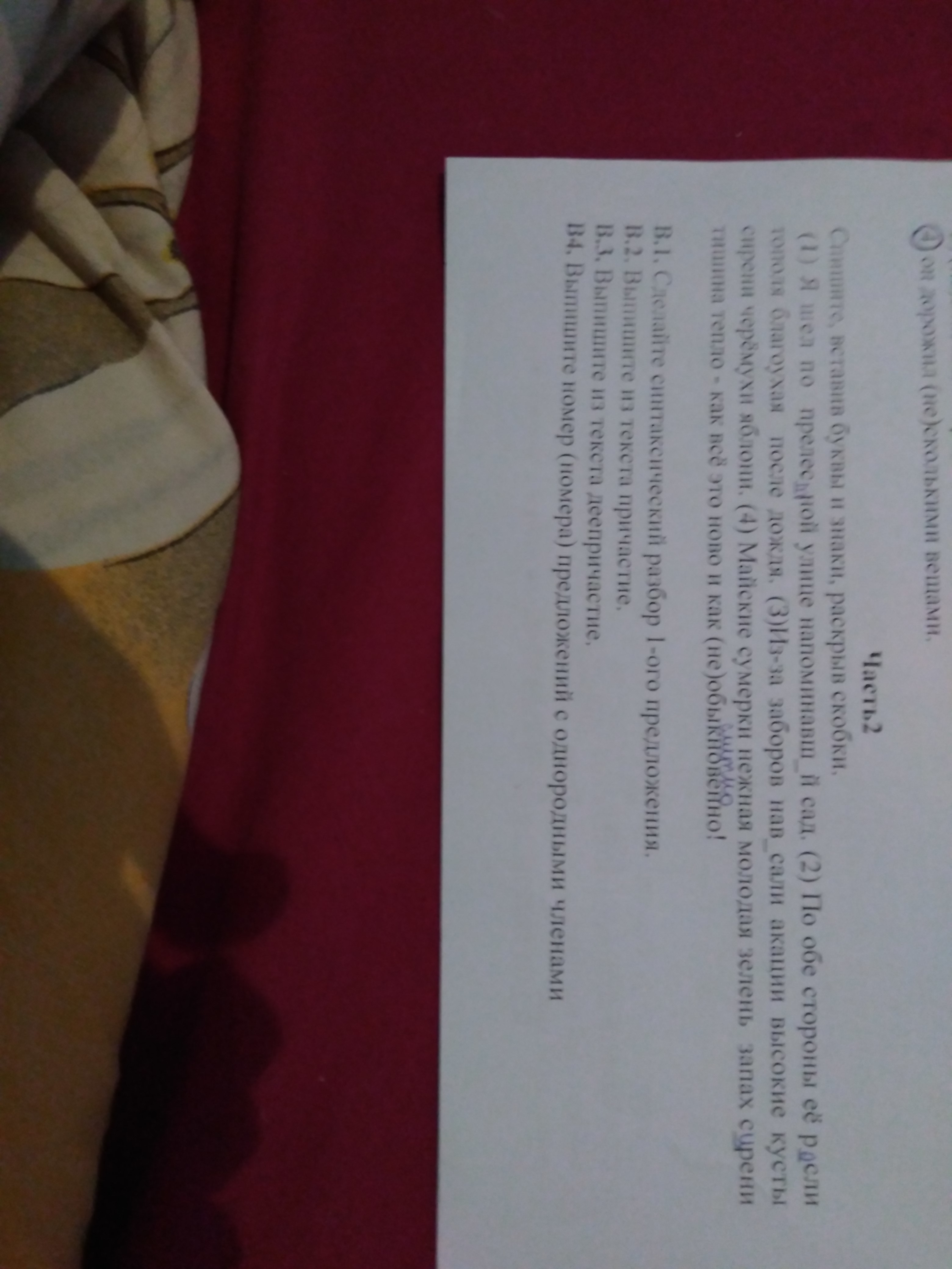 В1. Я(подлежащее) шел(сказуемое) по прелестной (определение) улице(дополнение) напоминавший сад(деепричастный оборот)