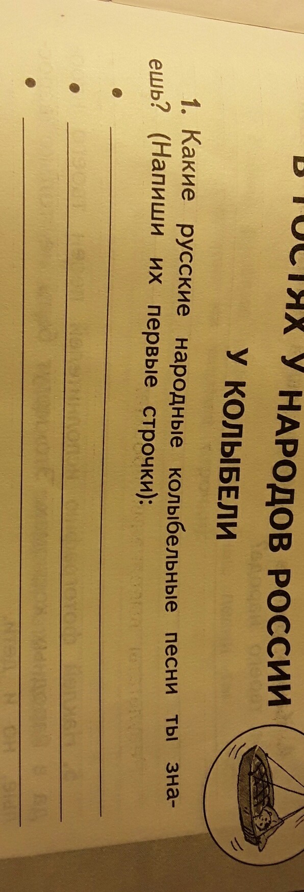 1. Какие русские народные колыбельные песни ты знаешь? (Напиши их первые строчки) : ●_______________________ ●_________________________●______________________ (3 ответа)