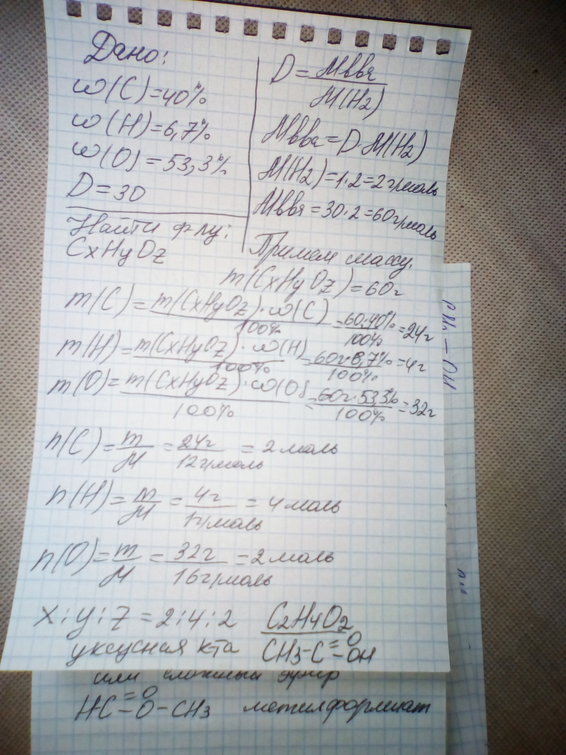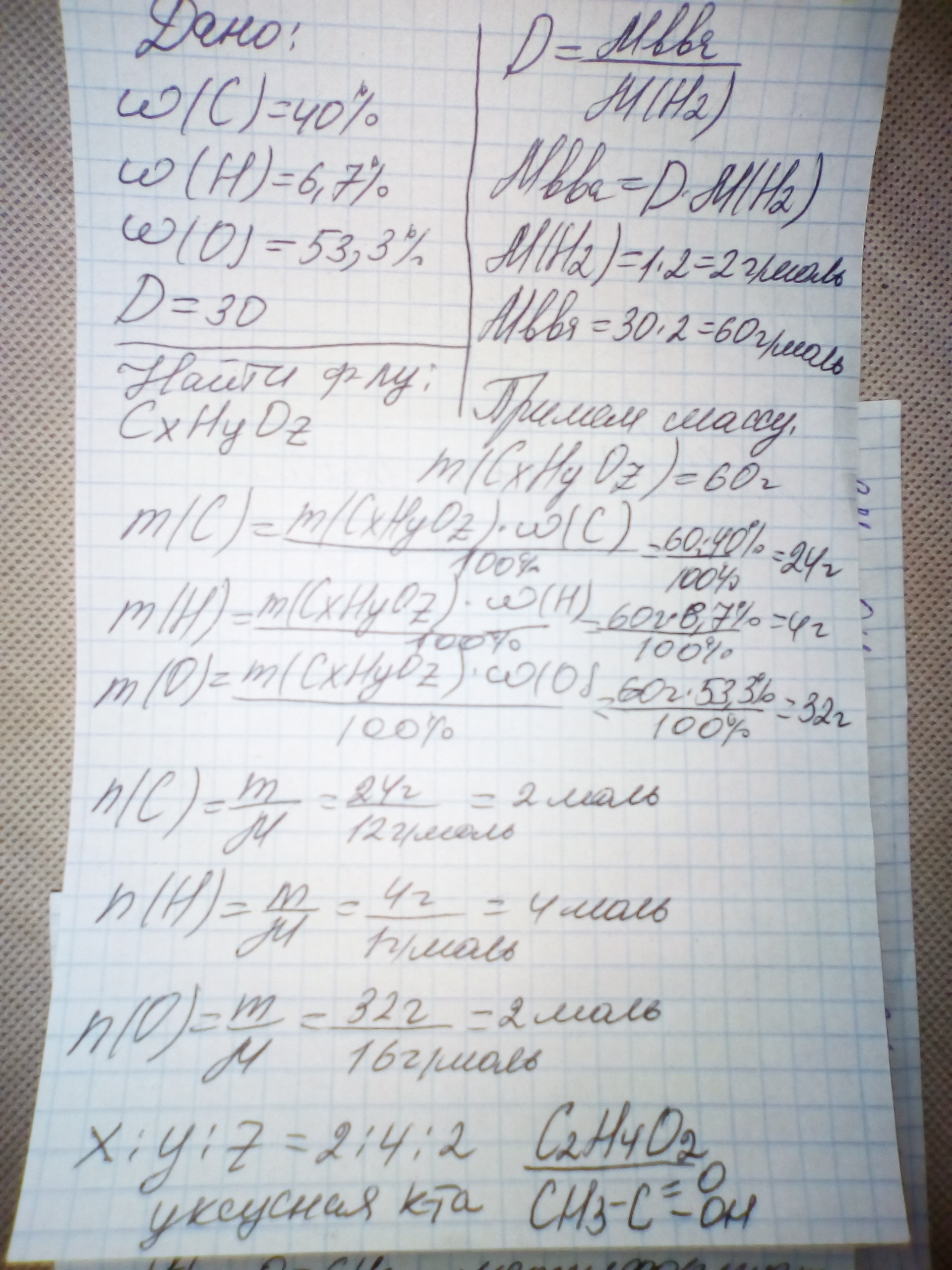 Выведите формулу кислородсодержащего вещества, содержащего 40% углерода ,6,7% водорода и 53,3% кислорода. Относительная плотность паров этого вещества по водороду равна 30.