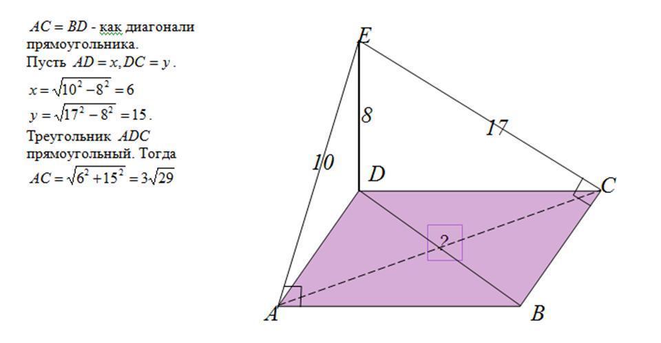 через вершину d прямокутника abcd до його площини проведено перпендикуляр de точка е віддалена від сторони ав на 10 см а від сторони вс на 17 см знайдіть довжину діагоналі вd якщо ed=8 см