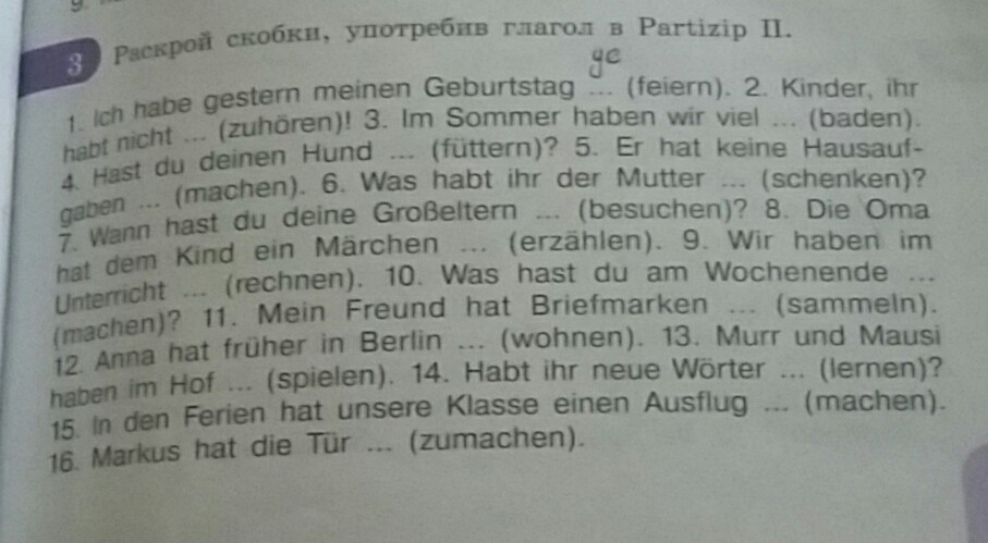 1. gefeiert 2. zugehört 3. gebadet 4. gefüttert 5. gemacht 6. geschenkt 7. besucht 8. erzählt 9. gerechnet 10. gemacht 11. gesammelt 12. gewohnt 13. gespielt. 14. gelernt. 15. gemacht 16. zugemacht