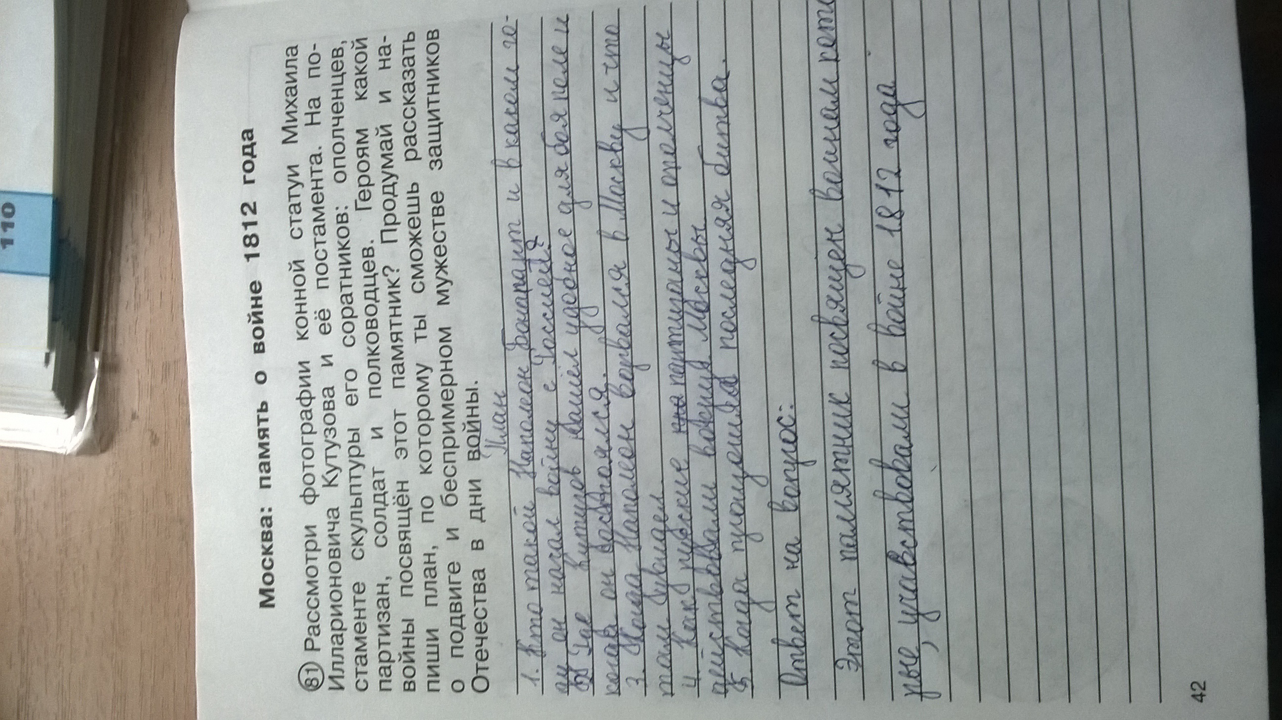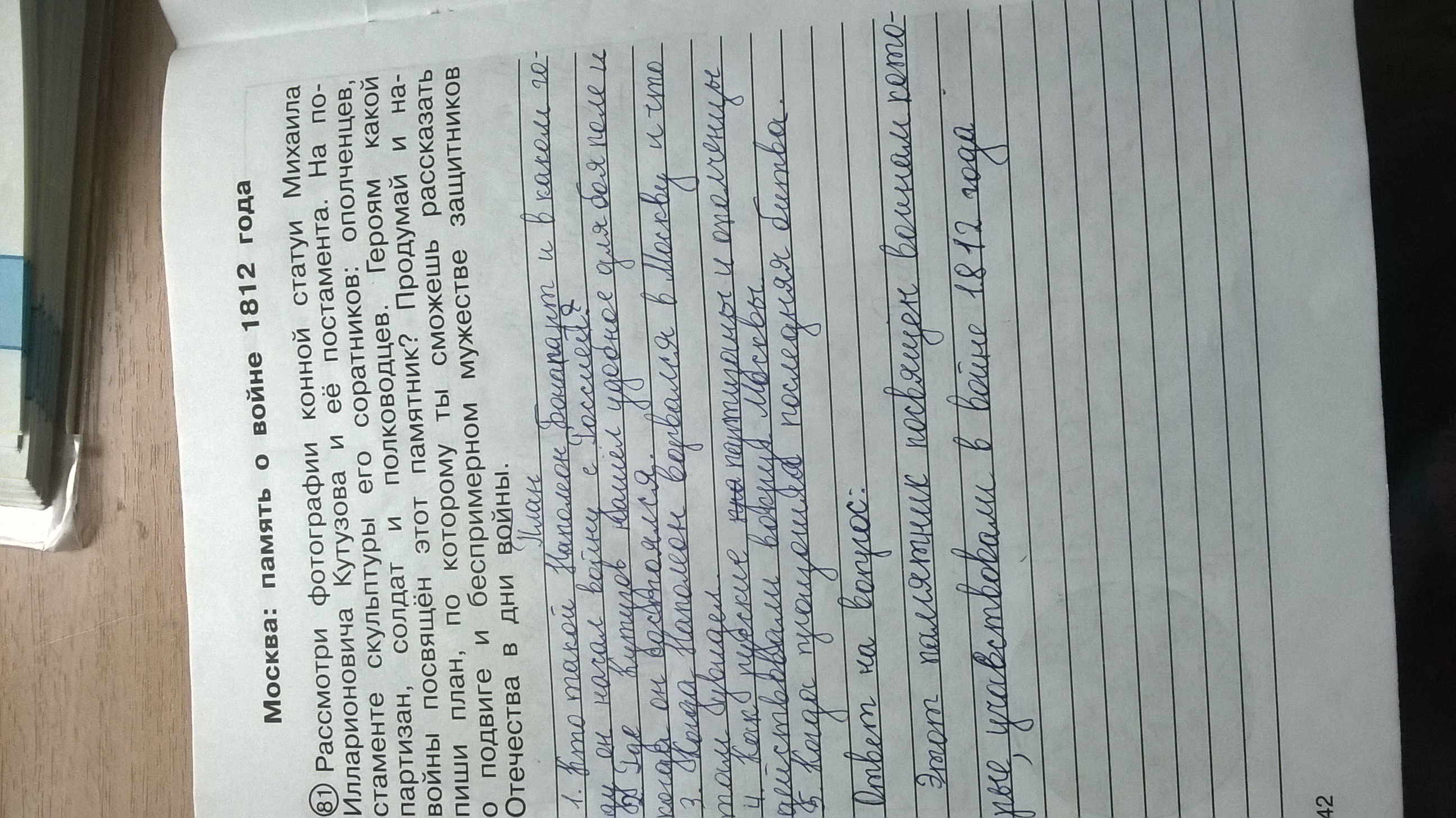 Рассмотри фотографии конной статуи Михаила Илларионовича Кутузова и её постамента. На постаменте скульптуры его соратников: ополченцов, партизан, солдат и полководцев. Героям какой войны посвящён этот памятник? Продумай и напиши план, по которому ты сможешь рассказать о подвиге и беспримерном мужестве защитников Отечества в дни войны.