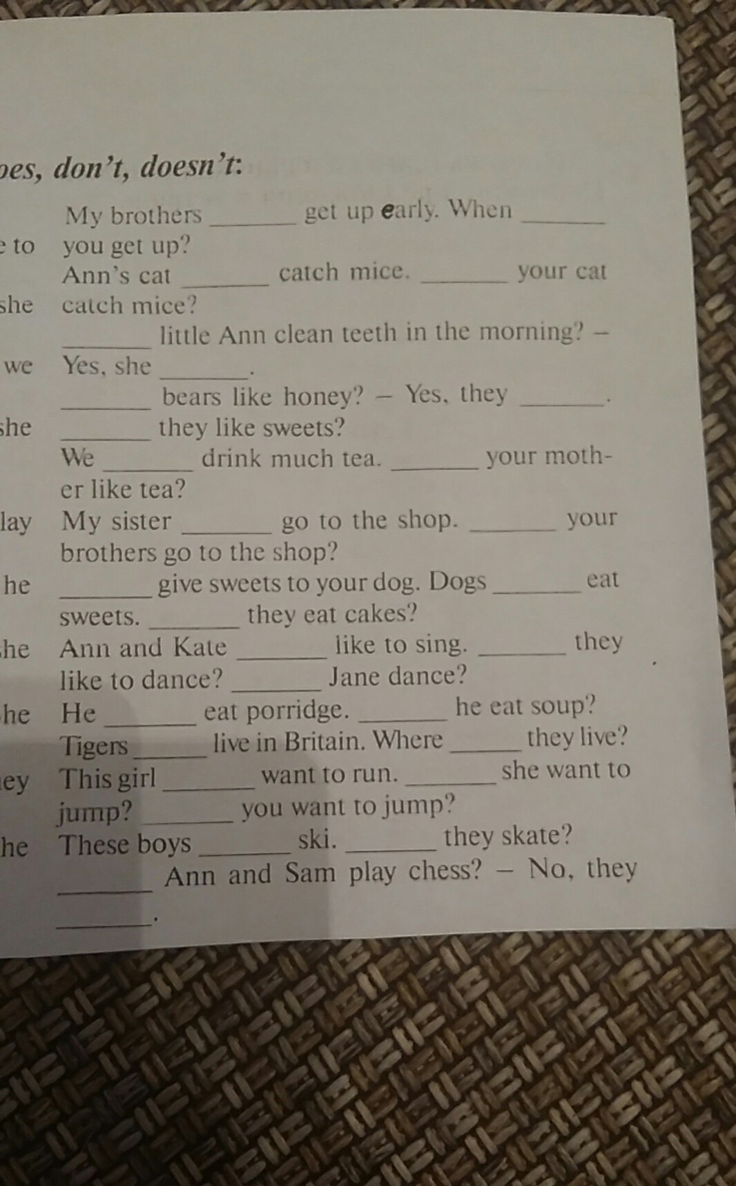 Вставь в пропуски глаголы do, does, don't, doesn't.