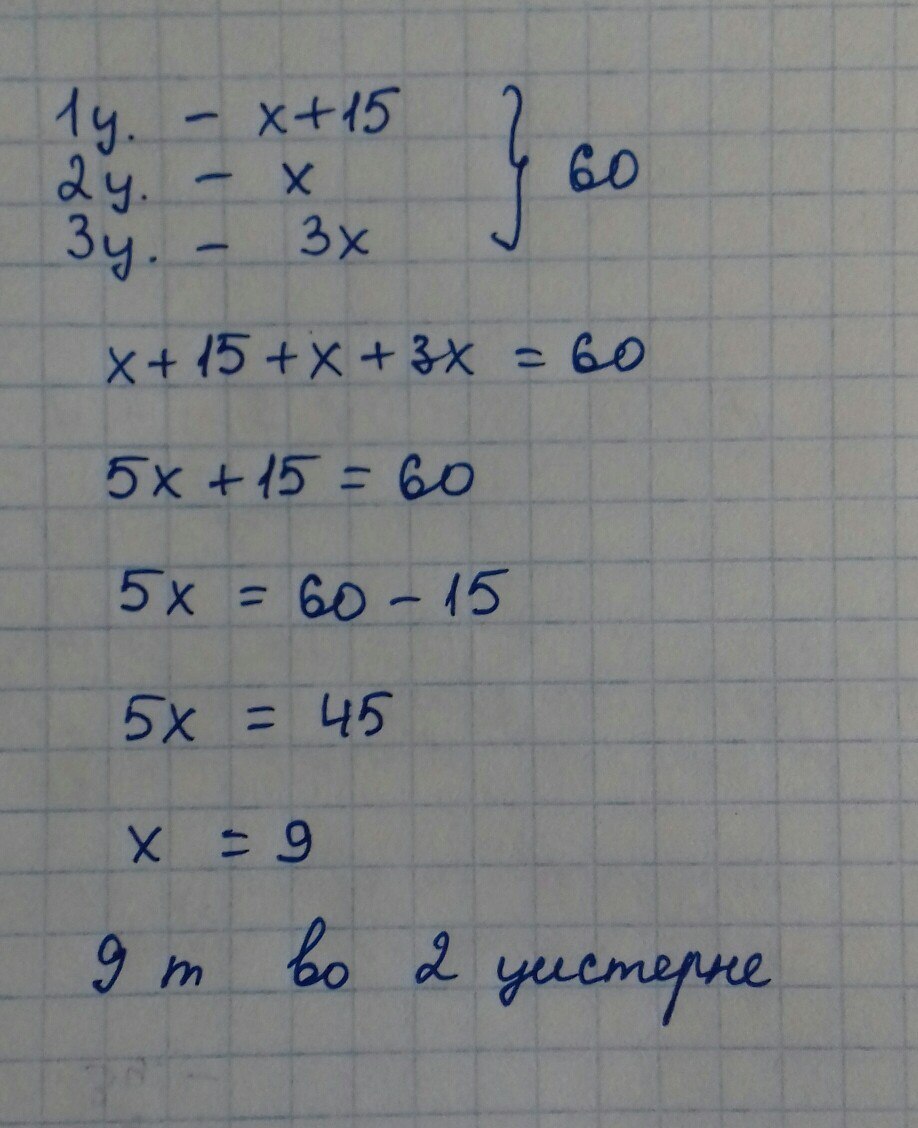 Помогите решить задачу. в трёх цистернах 60 т бензина В первой цистерне на 15 т больше чем во второй а в третьей в три раза больше .чем во второй Сколько тонн бензина во второй цистерне