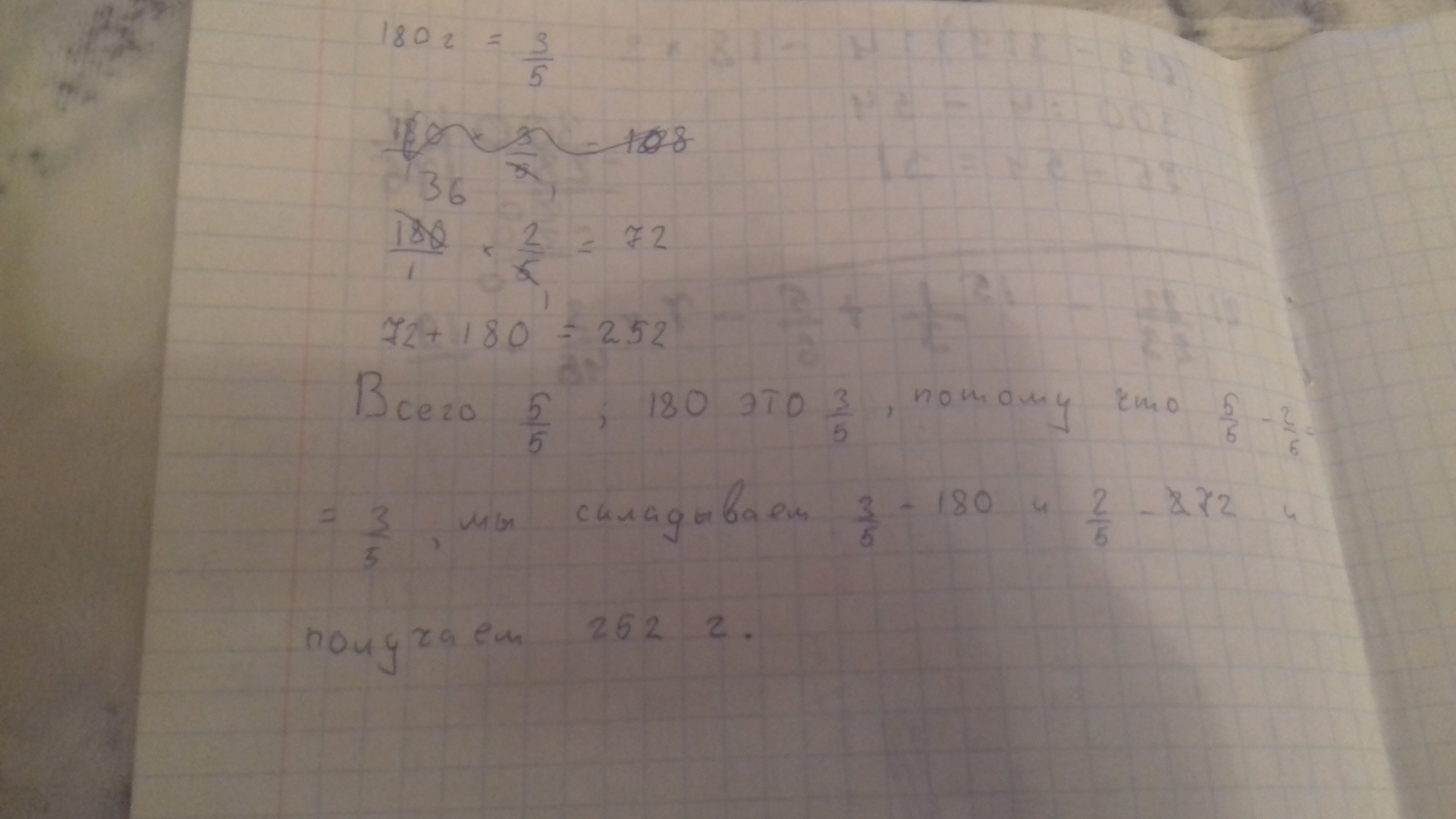 Помогите пожалуйста решить задачу: Отличник Василий Федоров по заданию учителя биологии составляет удобрение для комнатных растений. Вася составил смесь так, чтобы 2/5 состава был калий, а остальные 180 грамм составили другие химические вещества. Сколько всего смеси получится у отличника Васи.