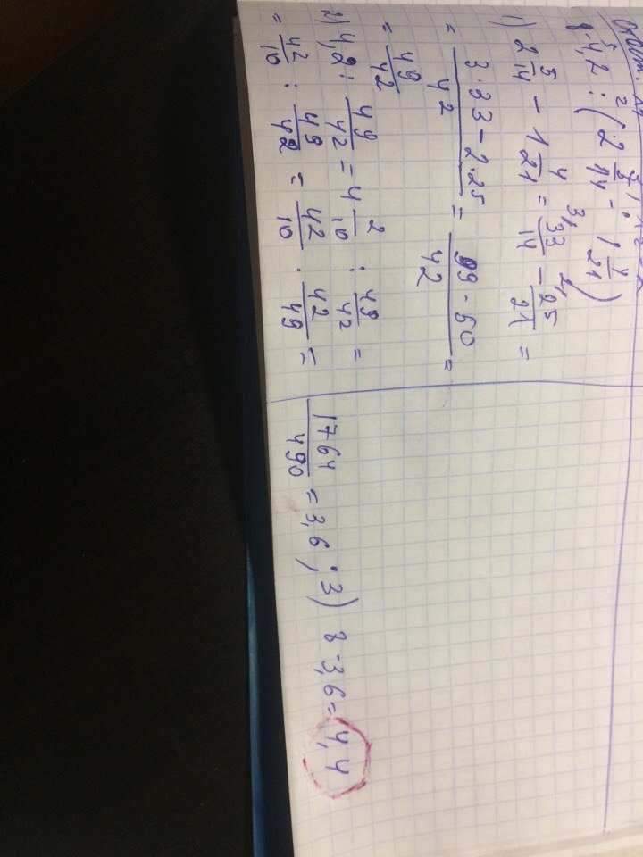 ,для того чтобы поделить,нужно вторую дробь перевернуть и умножить эти дроби ,получили 1764/490