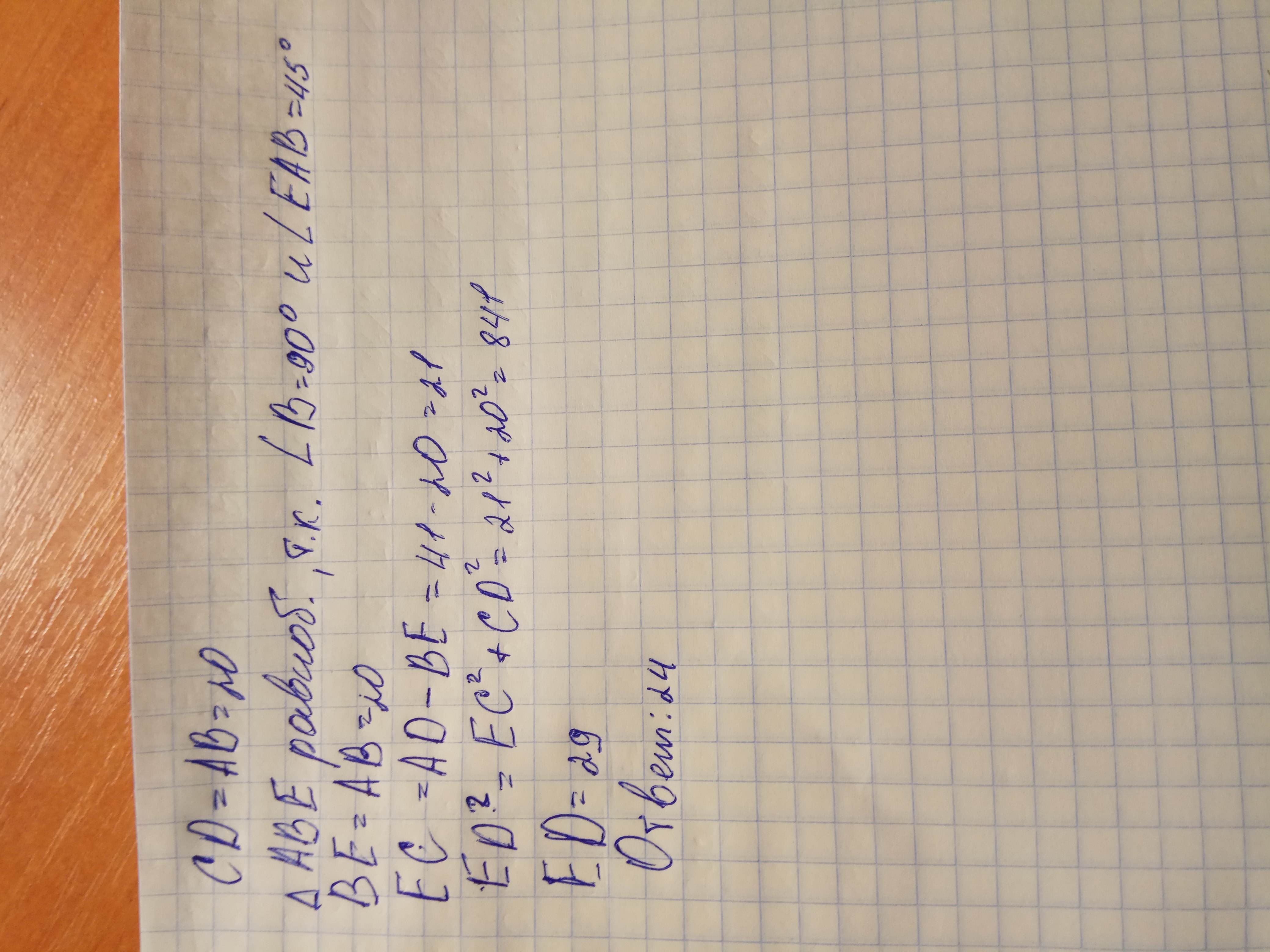 На стороне ВС прямоугольника АВС у которого АВ = 20 и АD=41 отмечена точка Е так что угол ЕАВ =45° Найдите ЕD