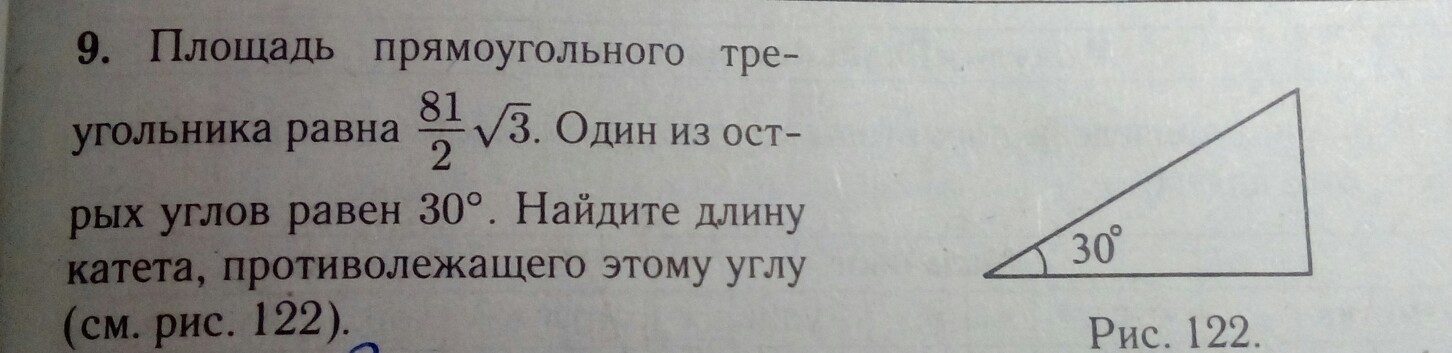 Площадь прямоугольного треугольника равен 81/2 корень из 3.Один из остальных углов=30°.Найдите длину карета,противолежащего этому углу.