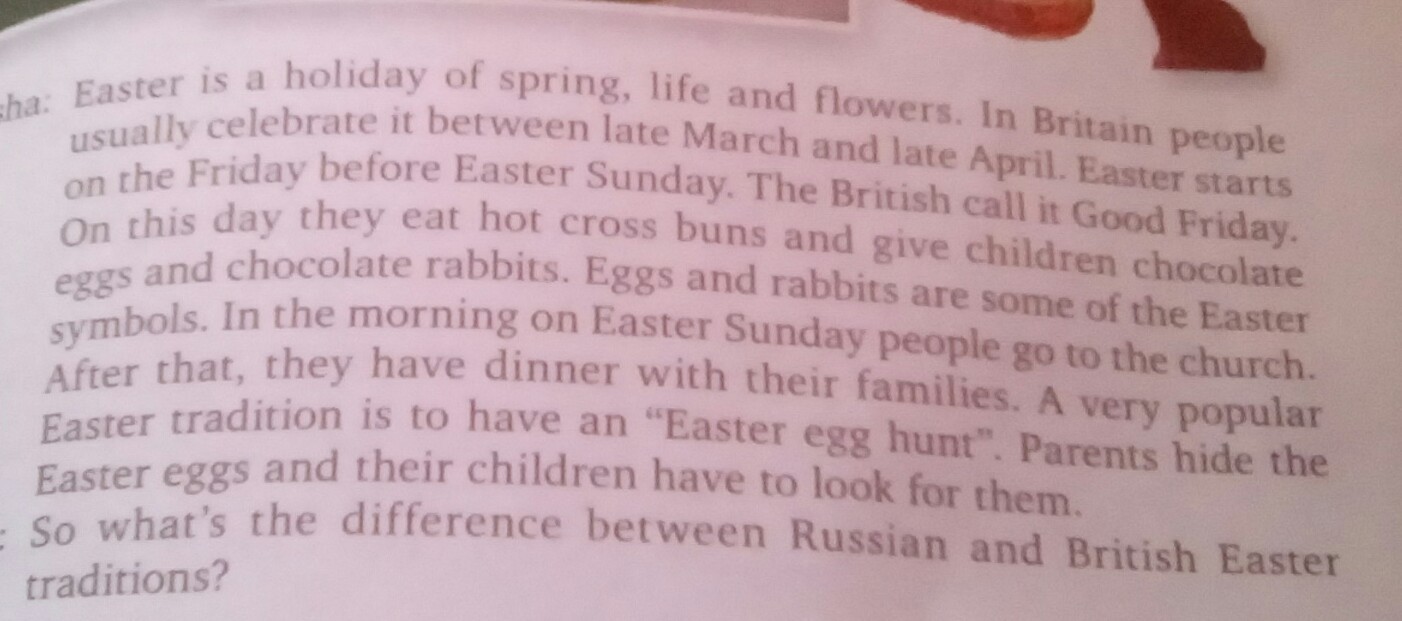 ПАСХА-праздник весны, жизни и цветов. В Британии обычно празднуют её между поздним мартом и поздним апрелем.Пасха начинается в пятницу перед пасхвльным воскресеньем. Британцы называют её Хорошей(Великой) пятницей.И этот день они едят булочки с изображением креста и дают детям шоколадные яйца и шоколадных кроликов.Яйца и кролики одни из пасхальных символов.Утром в пасхальное воскресенье люди идут в церковь.После этого они обедают со своей семьёй.Очень популярная пасхальная традиция- охота за пасхальными яйцами.Родители прячут пасхальные яйца, а дети должны их найти. Итак, какова разница между русскими и британскими пасхальными традициями?
