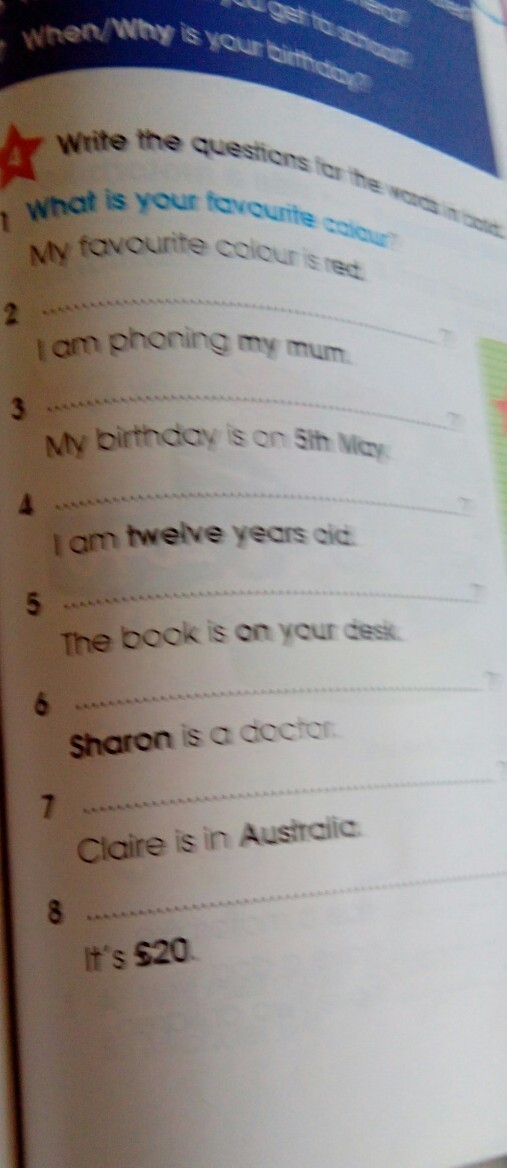 Whom are you phoning? 3 When is your birthday? 4How old are you? 5 Where is the book? 6Who is a doctor? 7Where is Claire? 8How much is it?