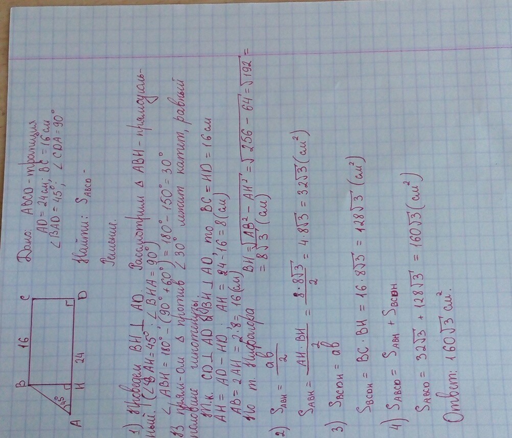 Вычислите площадь трапеции АВСД с основаниями АД и ВС если АД=24см,ВС=16см,угол А=45°,угол Д=90°