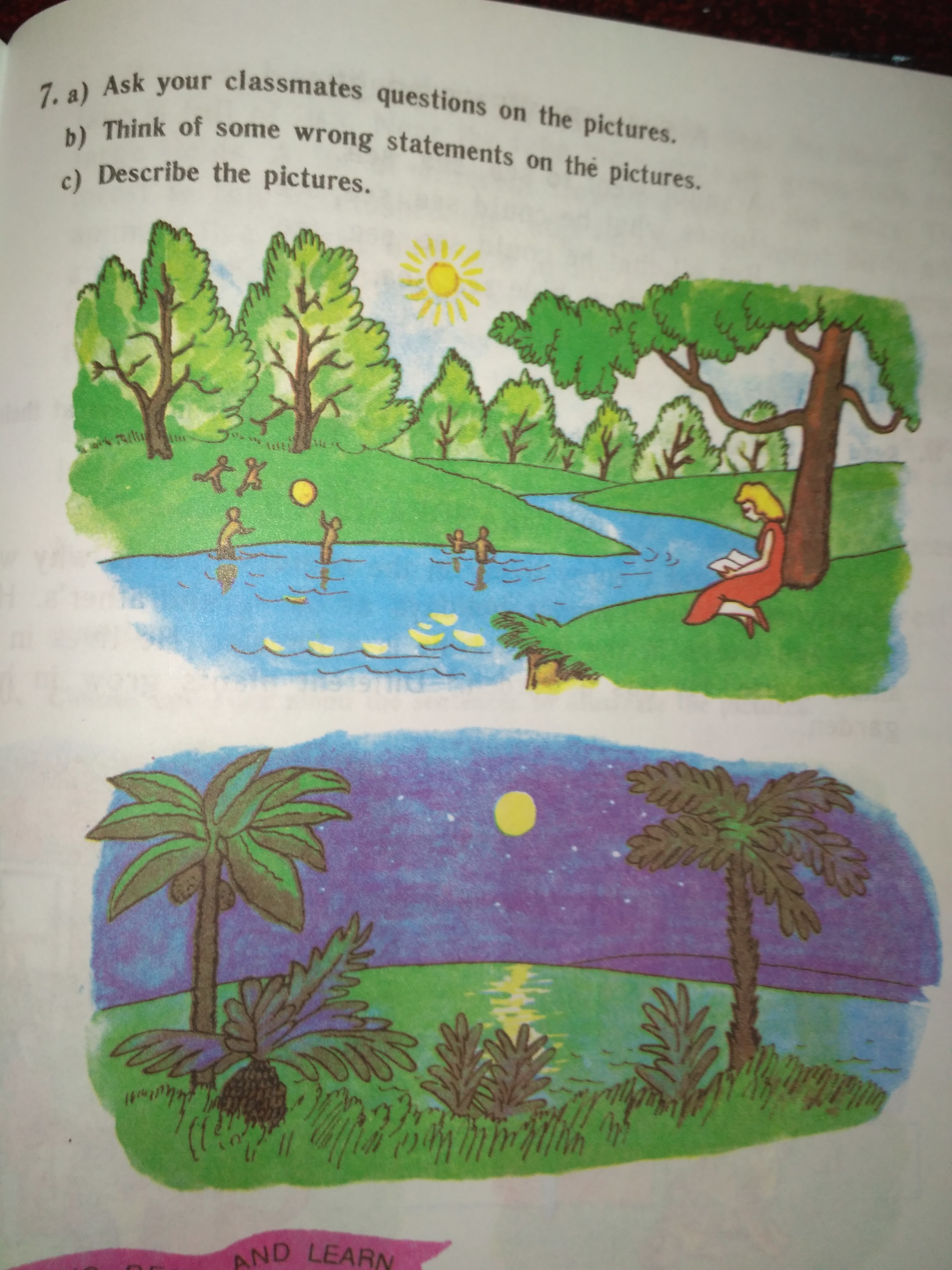 She is dark-skinned and there is bright blush on her cheeks. She has got thick dark hair, which is a bit tousled. The girl has got a pretty roundish face. Her eyebrows are dark and thick. She has got big brown eyes.
