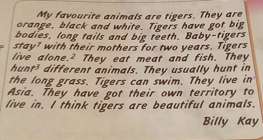 My favourite animal is a monkey. It's brown. Monkeys have got long tails. They can climb in the trees. They like to eat bananas best of all. Monkeys can't swim. They live in Africa. I think monkeys are funny animals.